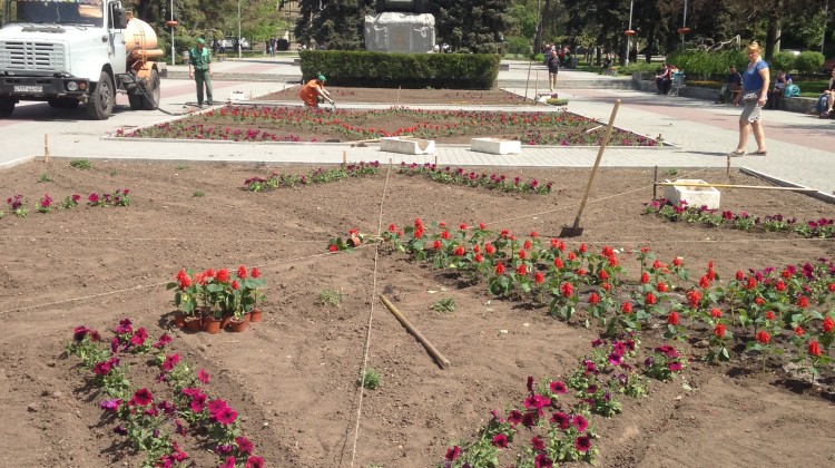 На площади Университетской высаживают алые декоративные клумбы