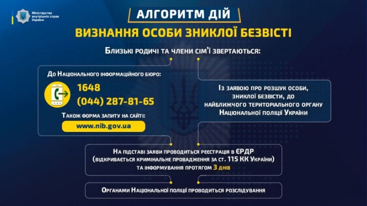 Розроблено алгоритм дій про визнання особи зниклої безвісти. ▪ Як йдеться у повідомленні, для близьких родичів та членів сім’ї, які розшукують рідних, розробили алгоритм дій …