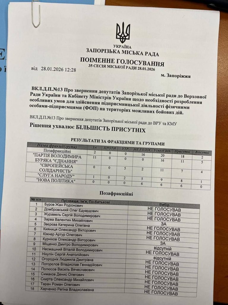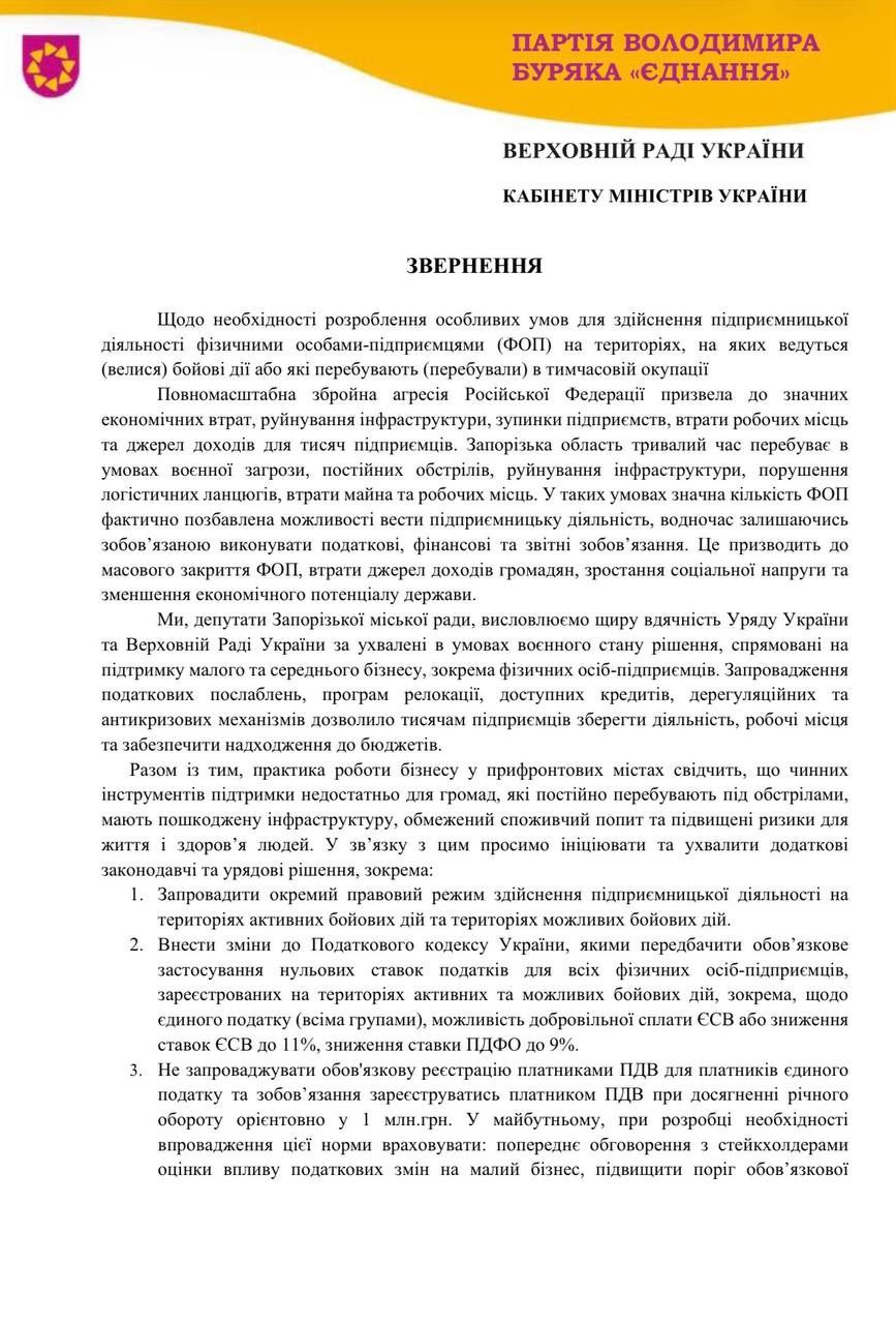 “Ми переконані: підприємці, які працюють у таких умовах, заслуговують на особливу увагу й підтримку. Це про можливість вистояти, зберегти робочі місця й не залишати місто, – зазначив лідер фракції “Єднання” Володимир Буряк. – Розраховую на зважене та відповідальне рішення депутатів. Підтримка цього звернення — це підтримка людей, які працюють і живуть у Запоріжжі”.