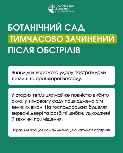 У зв’язку з нічною атакою у Запоріжжі був пошкоджений Ботанічний сад. На даний момент він не приймає відвідувачів. Про це повідомили працівники саду.