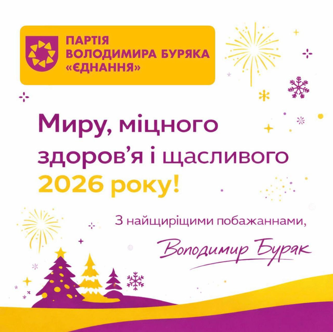 “Бажаю вам міцного здоров’я, світлих думок, надійних людей поруч і щасливих моментів, які дають сили жити далі.2026 рік нехай стане роком добрих змін, відновлення і кроків до нашого спільного майбутнього”, – з любов’ю до міста і з найщирішими побажаннями, Володимир Буряк, лідер партії «Єднання».