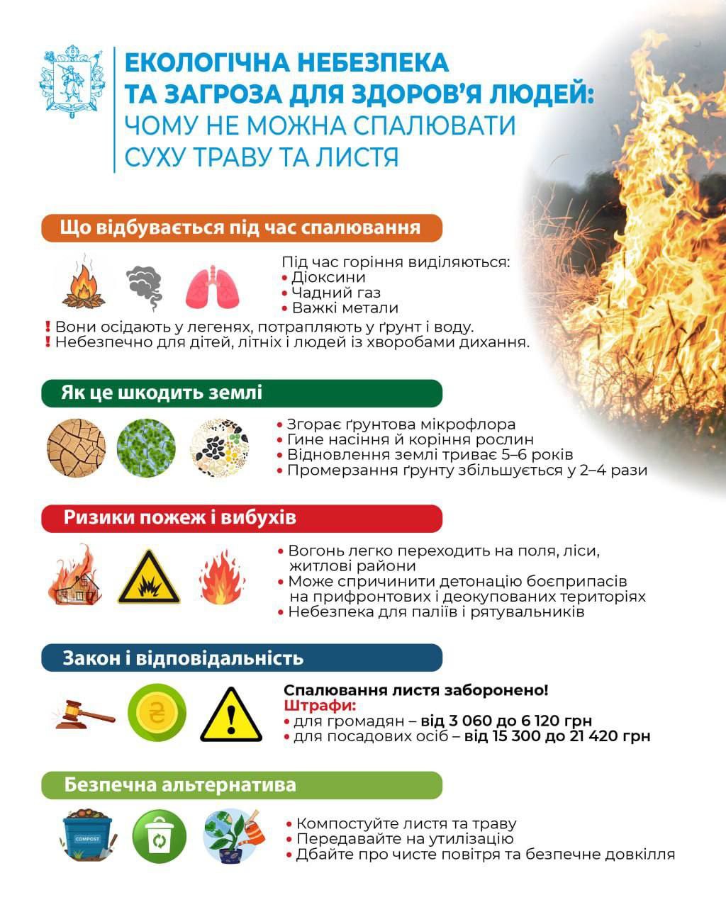 Екологічна небезпека та загроза для здоров’я людей: чому не можна спалювати суху траву та листя.